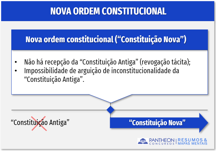 Como vimos, em relação à ruptura gerada pela nova ordem constitucional: (i) não há recepção de normas constitucionais, uma vez que esse fenômeno somente se dá entre norma infraconstitucional e a constituição – lei anterior à constituição que está em consonância com os seus termos pode ser recepcionada. Ante a total ruptura da ordem constitucional anterior, não há que se falar em recepção de normas constitucionais pretéritas; (ii) impossibilidade de arguição de inconstitucionalidade de normas constitucionais, uma vez que o parâmetro passa ser a nova constituição.