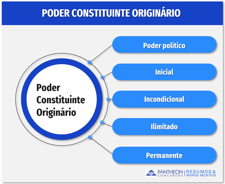 O Poder Constituinte Originário tem como características: ser um poder político, pois organiza o estado e seus poderes; ser inicial porque dá origem a um novo ordenamento jurídico; ser incondicional porque não se sujeita condições predefinidas; ser ilimitado, pois não reconhece nenhum limite anterior; e, por fim, ser permanente porque não se esgota com o tempo.