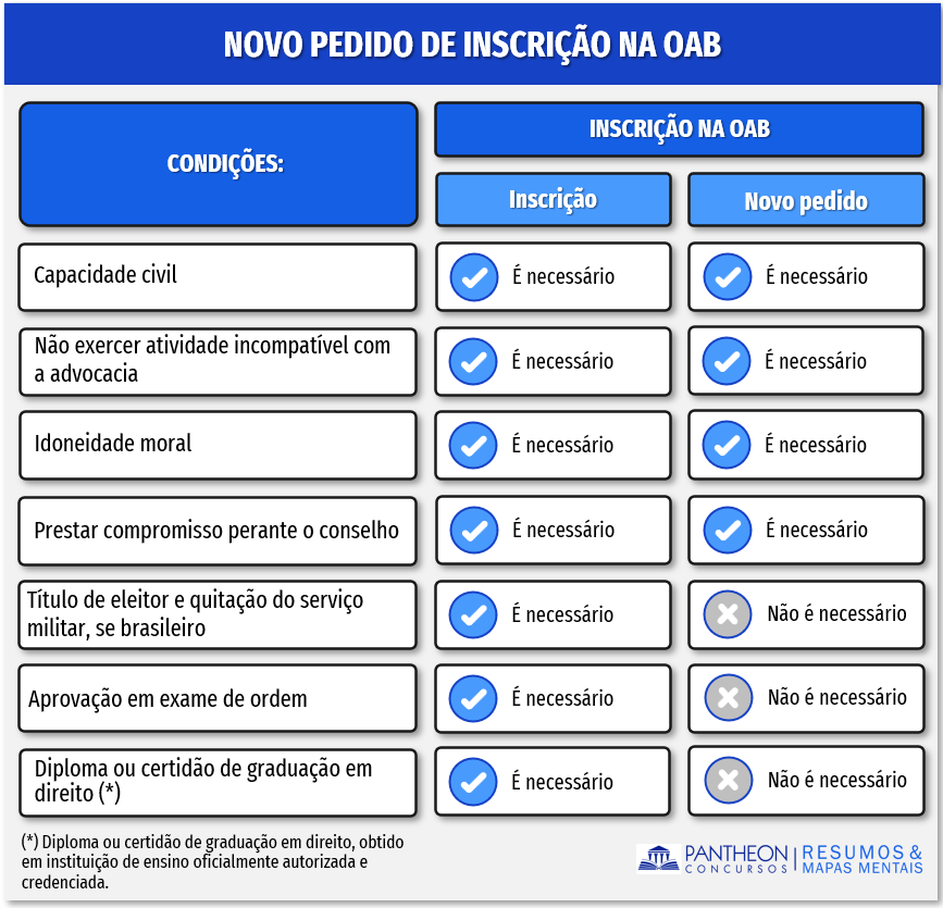 Em caso de novo pedido, que não restaure o número de inscrição anterior, o interessado deve fazer prova novamente de alguns dos requisitos dispostos no art. 8º do EAOAB. Para facilitar vamos montar um quadro comparativo entre.