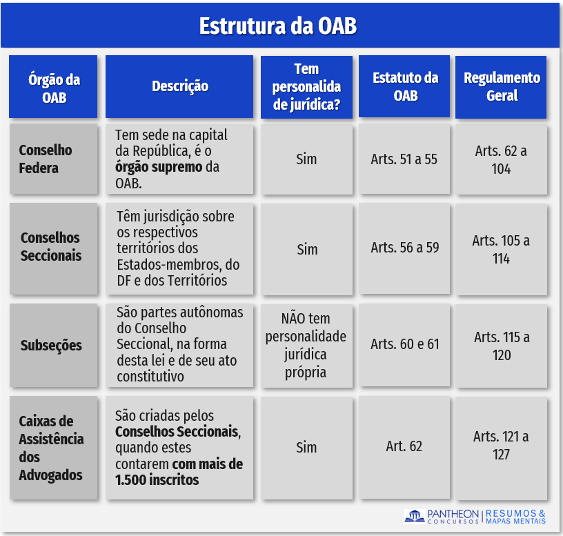 A OAB está dividida em quatro órgãos, adiantamos que estudaremos detalhadamente cada um dos órgãos ainda nessa aula: