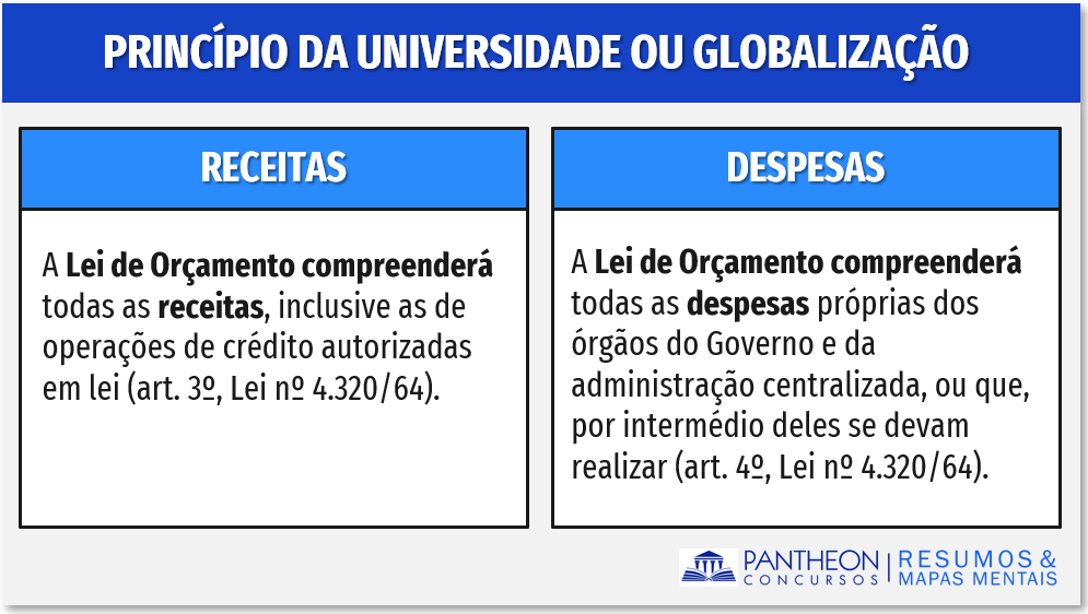 O princípio da universalidade prevê que todas as despesas e receitas do Poder Público estarão previstas na LOA, isto é, o orçamento dos três Poderes, incluindo seus fundos, órgãos, entidades conterá todas as receitas e todas as despesas. Na Constituição Federal, o princípio da universalidade encontra previsão no art. 165, § 5º: