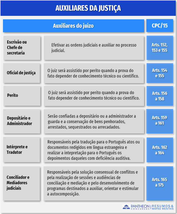 Para facilitar montamos um quadro com as principais informações dos auxiliares da justiça com a indicação dos artigos para posterior leitura.