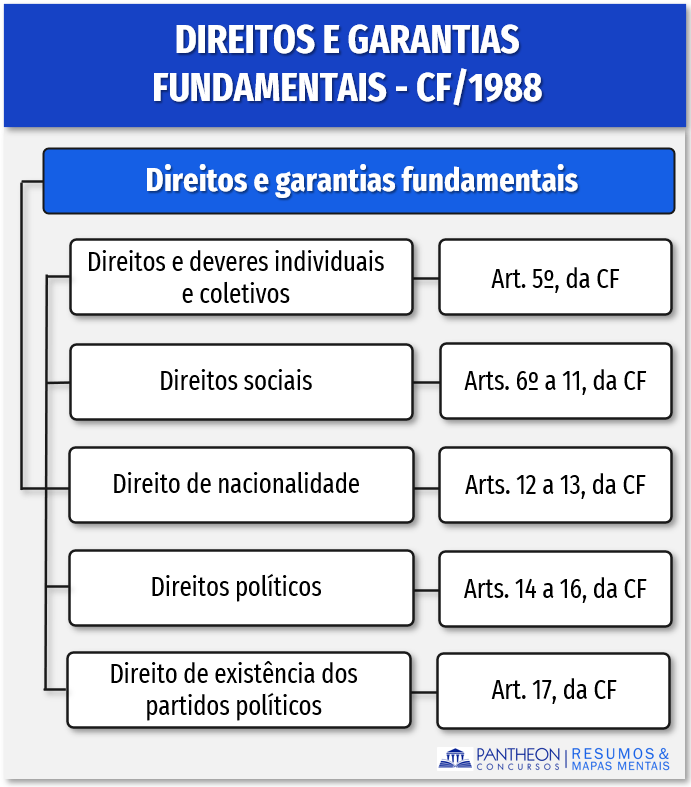 A Constituição Federal de 1988, além de outros dispositivos espalhados pela Carta Maior, estabelece no Título II as normas referentes aos Direitos Fundamentais, entre os arts. 5º a 17, que estão classificados em cinco grupos: direitos individuais e coletivos (art. 5º); direitos sociais (arts. 6º a 11); direito de nacionalidade (arts. 12 e 13); direitos políticos (arts. 14 a 16); e, por fim, direito de existência dos partidos políticos (art. 17).