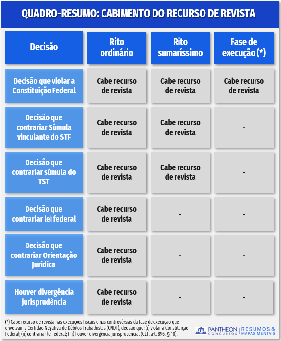 Finalmente, a Consolidação das Leis do Trabalho admite recurso de revista quando houver violação à lei federal, por divergência jurisprudencial e por ofensa à Constituição Federal nas execuções fiscais e nas controvérsias da fase de execução que envolvam a Certidão Negativa de Débitos Trabalhistas – CNDT (CLT, art. 896, § 10º).