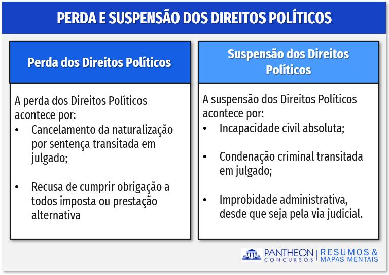 Como são poucos itens é interessante gravar essa informação, pois a FGV tentará confundir o candidato invertendo as informações – por exemplo, indicando como hipótese de perda dos direitos políticos a incapacidade civil absoluta, sendo que se trata de uma hipótese de suspensão dos direitos.