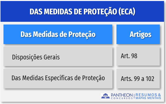 O ECA dedica o Título II para dispor acerca das medidas de proteção (arts. 98 a 102), o tema está dividido entre as disposições gerais (art. 98) e as medidas específicas de proteção (arts. 99 a 102):
