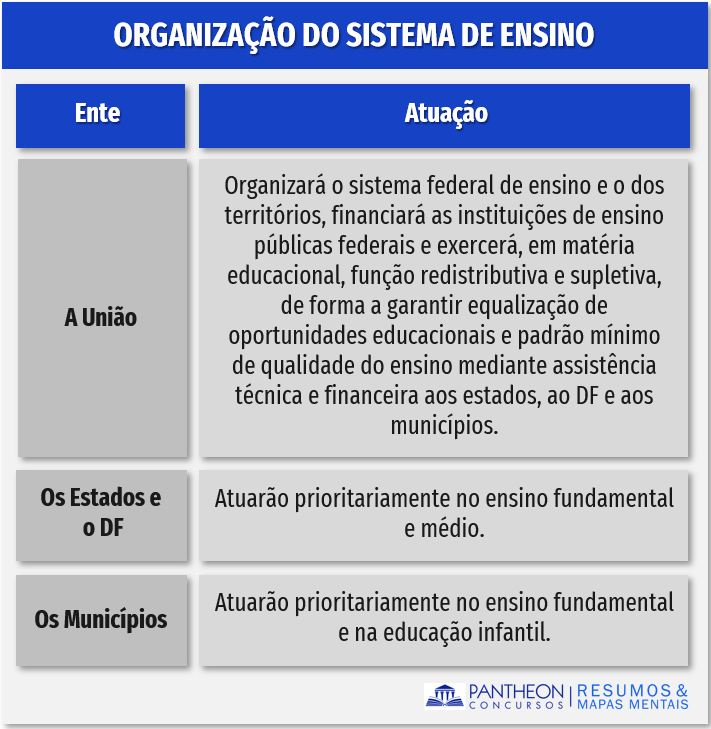 O art. 211 e parágrafos disciplinam como se dará a organização do sistema de ensino no Brasil. A União, os Estados, o Distrito Federal e os Municípios organizarão em regime de colaboração seus sistemas de ensino.