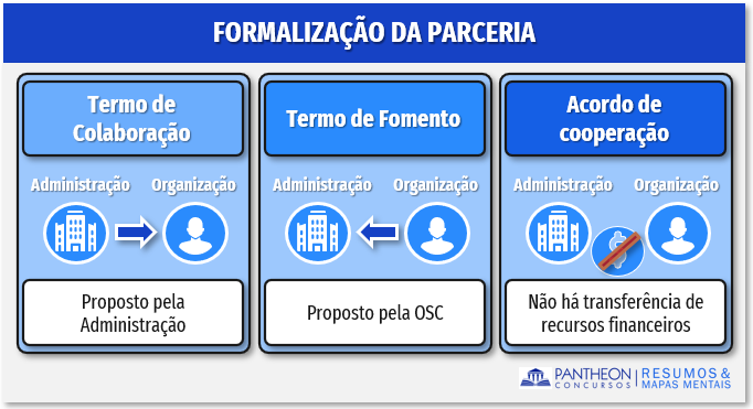 Como vimos acima, a parceria entre a Administração Pública e as OSC será formalizada mediante os instrumentos de: (a) termo de colaboração, (b) termo de fomento ou (c) acordo de cooperação.