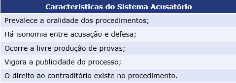 Neste sistema existe a separação entre o órgão de acusação e aquele que realiza o julgamento. Há também a imparcialidade por parte do julgador. São características deste modelo: