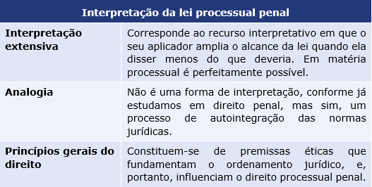 Ademais, a redação do art. 3º do CPP prevê que a lei processual pena admitirá interpretação extensiva e aplicação analógica, bem como o suplemento dos princípios gerais do direito. Vamos colocar em um quadro para facilitar o entendimento?