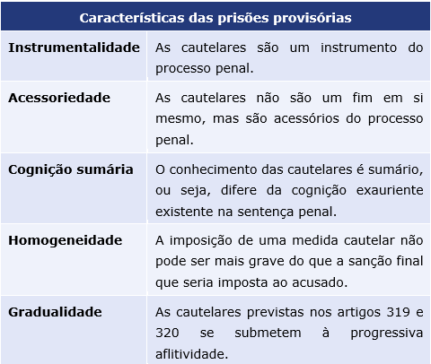 De forma didática, apresento a vocês o nosso quadro esquematizado com as características das prisões provisórias.