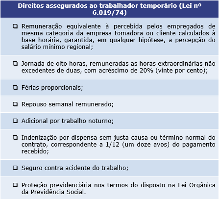Ainda, segundo o artigo 12 do mesmo dispositivo legal, qual seja a Lei nº 6.019/74 são assegurados ao trabalhador temporário os seguintes diretos: