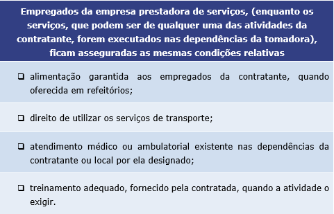No caso de empregados da empresa prestadora de serviços, (enquanto os serviços, que podem ser de qualquer uma das atividades da contratante, forem executados nas dependências da tomadora), ficam asseguradas as mesmas condições relativas a: