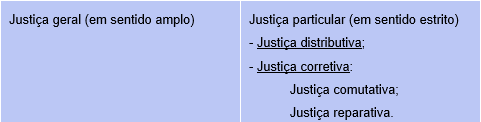 Portanto, conforme o pensamento aristotélico, o gênero Justiça se divide em:
