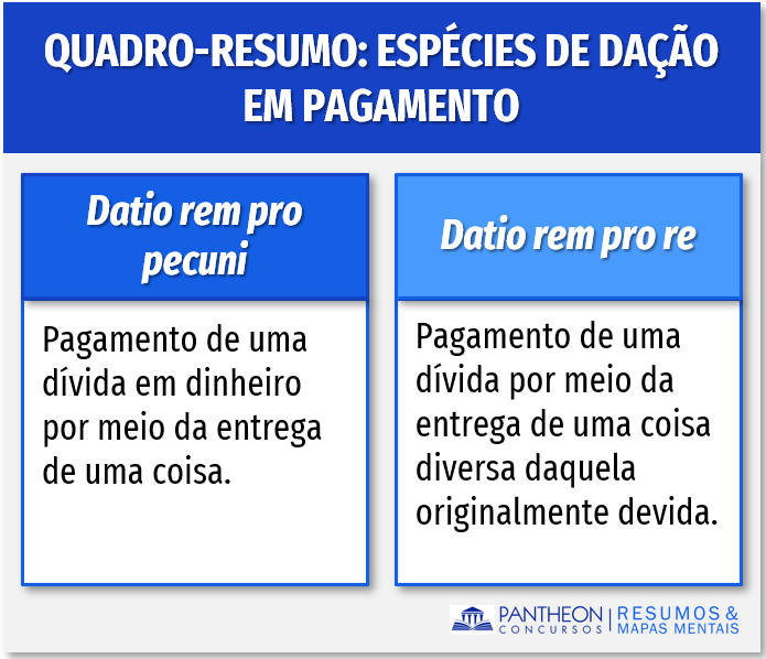 A doutrina classifica que a dação em pagamento poderá se dar em duas formas: na substituição de dinheiro por bem (datio rem pro pecuni), p. ex. devedor dá um carro no lugar de pagar uma dívida de 20 mil reais; ou na substituição de coisa no lugar de outra coisa (datio rem pro re), o. ex. devedor dá um carro em substituição de uma moto.
