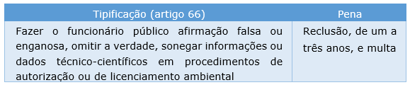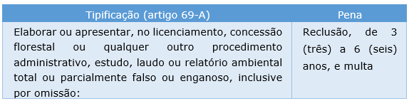 Art. 69-A. Elaborar ou apresentar, no licenciamento, concessão florestal ou qualquer outro procedimento administrativo, estudo, laudo ou relatório ambiental total ou parcialmente falso ou enganoso, inclusive por omissão: