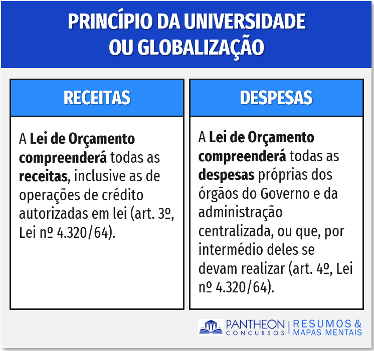 O princípio da universalidade prevê que todas as despesas e receitas do Poder Público estarão previstas na LOA, isto é, o orçamento dos três Poderes, incluindo seus fundos, órgãos, entidades conterá todas as receitas e todas as despesas. Na Constituição Federal, o princípio da universalidade encontra previsão no art. 165, § 5º: