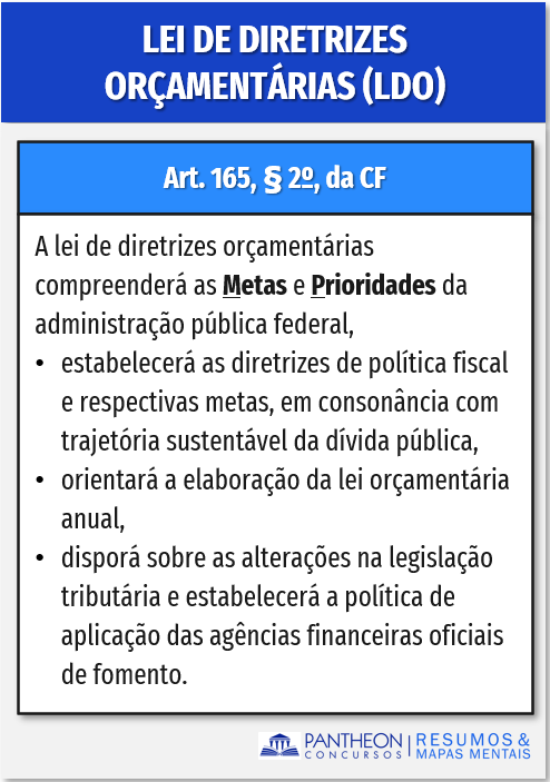 De acordo com o art. 165, § 2º da CF: “A lei de diretrizes orçamentárias compreenderá as metas e prioridades da administração pública federal, estabelecerá as diretrizes de política fiscal e respectivas metas, em consonância com trajetória sustentável da dívida pública, orientará a elaboração da lei orçamentária anual, disporá sobre as alterações na legislação tributária e estabelecerá a política de aplicação das agências financeiras oficiais de fomento”.