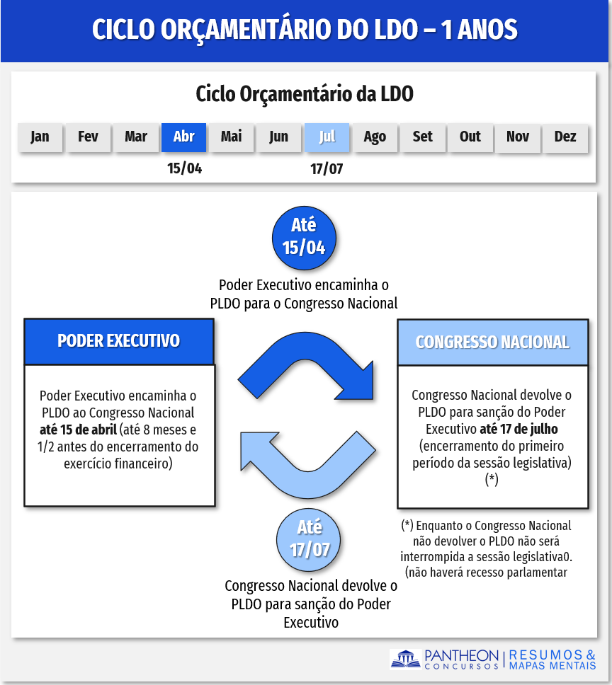 Quanto ao ciclo orçamentário da LDO, o art. 35, § 2º, inciso II, do ADCT, o projeto de lei de diretrizes orçamentárias será encaminhado até oito meses e meio antes do encerramento do exercício financeiro e devolvido para sanção até o encerramento do primeiro período da sessão legislativa. Ou seja, o PLDO será encaminhado ao CN pelo Poder Executivo até dia 15 de abril e deverá ser devolvido para sanção até 17 de julho (final do primeiro período da sessão legislativa).