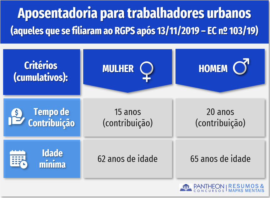 No caso dos trabalhadores urbanos que não possuíam vínculo com o INSS antes do dia 13 de novembro de 2019 (data da entrada em vigor da EC nº 103/2019 – Reforma da Previdência), aplicar-se-ão as novas regras, dentre essas, uma das mais sensíveis alterações foi a necessidade de o segurado cumprir, cumulativamente, dois requisitos: a idade mínima e o tempo mínimo de contribuição. Vamos conferir o artigo 201, § 7º, com redação altera pela Emenda Constitucional nº 103 de 2019 (Reforma da Previdência):