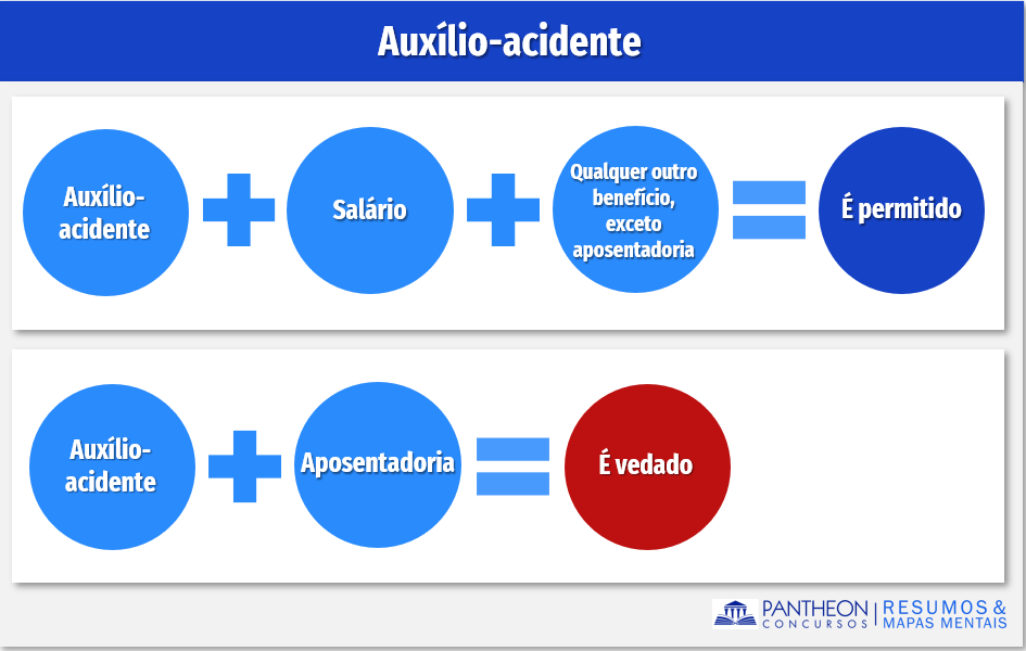 Nesse sentido, o § 1º, do art. 86, da Lei nº 8.213/91 declara que o auxílio-acidente mensal corresponderá a 50% do salário-de-benefício e será devido até a véspera do início de qualquer aposentadoria ou até a data do óbito do segurado, sendo vedada sua concessão cumulativa com qualquer outra aposentadoria, todavia, é permitido o recebimento do auxílio-acidente junto com o salário ou com qualquer outro benefício. Em suma, para deixar mais claro vamos montar o esquema: