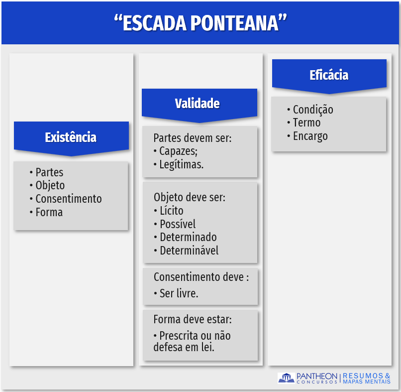 O Código Civil não adotou plenamente a “escada ponteana” pois o legislador não tratou expressamente do plano da existência, todavia, tal plano está implícito no Código Civil, encontrando base nos fatos jurídicos. Sempre com o propósito de facilitar o conteúdo, montamos a “escada ponteana” com todos seus elementos: