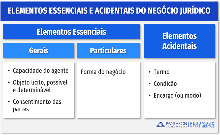 Importante: a doutrina também elenca os “elementos naturais”, que são uma decorrência natural do negócio jurídico, sendo prescindida sua presença no ato negocial. Para fins de prova nos ateremos aos dois primeiros – os elementos essenciais e acidentais. Assim, o negócio jurídico pode ser composto de: