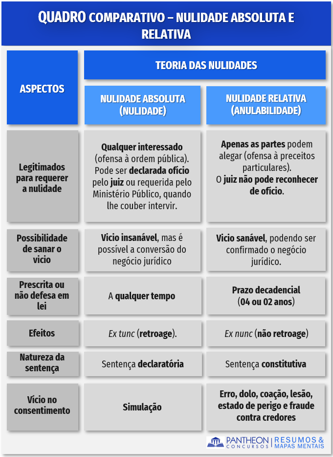 Pessoal, por vezes a FGV, nas provas do Exame de Ordem, troca aspectos relativos à nulidade absoluta com os da nulidade relativa e vice-versa. Diante disso, montamos um quadro comparativo contendo os principais pontos de cada instituto.