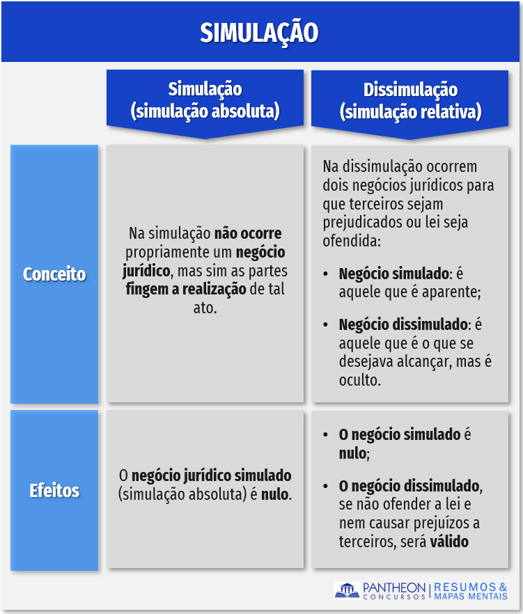 Na simulação (simulação absoluta) não ocorre propriamente um negócio jurídico, mas sim o que se realiza é um fingimento de um negócio jurídico, para que, com isso, se crie uma aparência, uma simulação. Como consequência, na simulação absoluta o negócio jurídico é nulo – primeira parte do Artigo 167 do Código Civil: “Artigo 167. É nulo o negócio jurídico simulado (...)”.