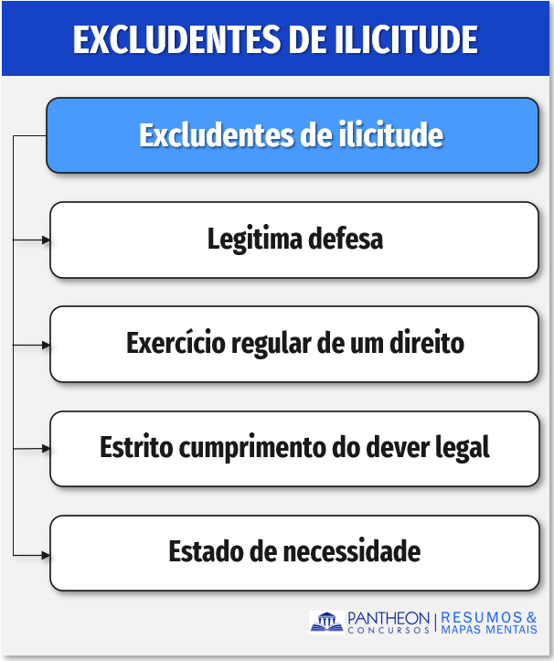 Figura muito presente no nosso dia a dia, a legítima defesa constitui-se em uma das causas de excludente de ilicitude, ou seja, onde o ato, por ter sido executado em legítima defesa, deixa de ser ilícito. Como exemplo podemos citar uma pessoa que, ao ser vítima de um agressor, o agride para afastá-lo. Ressalta-se que os meios utilizados devem ser aqueles estritamente necessários! Ainda, podemos ter a figura da legítima defesa putativa (aquela em que a pessoa pensa estar sofrendo uma agressão quando na verdade não está ocorrendo!).