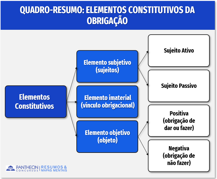 Dessa forma, é possível depreender que na obrigação temos uma relação jurídica estabelecida, que se desdobra em três elementos constitutivos: elementos subjetivos; elemento Objetivo; elemento imaterial.