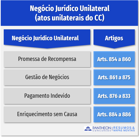 O Código Civil prevê expressamente os seguintes atos unilaterais: Promessa de Recompensa (art. 854 a 860); Gestão de Negócios (art. 861 a 875, CC); Pagamento Indevido (art. 876 a 883, CC); Enriquecimento sem Causa (art. 884 a 886, CC).