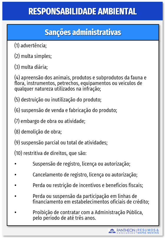 De acordo com o art. 72 da Lei nº 9.605/1998, são 10 (dez) as sanções que podem ser aplicadas pelo cometimento de uma infração administrativa ambiental, a saber: