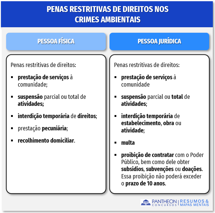 Na lei de crimes ambientais, o sistema trifásico de aplicação da pena é diferente para pessoas físicas e jurídicas. Elaboramos uma tabela comparativa das penas, sendo importante prestar atenção nas diferenças.