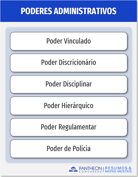 Os principais poderes administrativos apontados pela melhor doutrina e os que são comumente cobrados nas provas são: o poder vinculado, poder discricionário, poder disciplinar, poder hierárquico, poder regulamentar; poder de polícia.