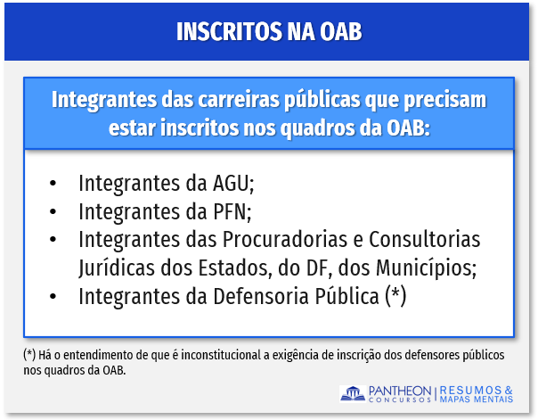 Em relação à Defensoria Pública temos uma controvérsia. O Supremo Tribunal Federal em julgamento do RE 1.240.999, com repercussão geral e da ADI 4.636 decidiu pela inconstitucionalidade da exigência da inscrição dos defensores públicos na OAB. Em seu voto, o Ministro Gilmar Mendes (Relator) se manifestou, “considerando que a aplicação literal do Estatuto da OAB pode vir a contrariar o fundamento da presente decisão, confiro interpretação conforme à Constituição ao art. 3º, caput e § 1º, da Lei 8.906/1994, a fim de afastar qualquer interpretação que resulte no condicionamento da capacidade postulatória dos membros da Defensoria Pública à inscrição dos Defensores Públicos na Ordem dos Advogados do Brasil”. O Superior Tribunal de Justiça já havia adotado entendimento semelhante: os defensores públicos têm regime próprio, não se submetendo, portanto, à Lei nº 8.906/94, prescindido estarem inscritos nos quadros da OAB.