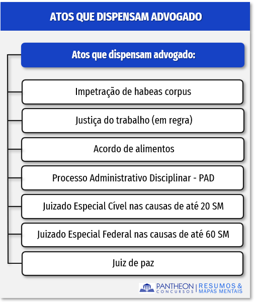 E são justamente esses atos que são costumeiramente cobrados nas provas do Exame da OAB. Desse modo, elencamos abaixo as situações que prescindem de advogado, com a respectivo ordenamento jurídico ou súmula dos tribunais superiores.