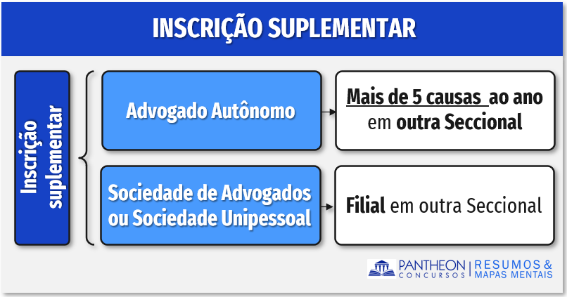 Ainda, além da principal, o advogado deve promover a inscrição suplementar nos Conselhos Seccionais em cujos territórios passar a exercer habitualmente a profissão considerando-se habitualidade a intervenção judicial que exceder de cinco causas por ano (Lei nº 8.906/94, art. 10, § 2º).