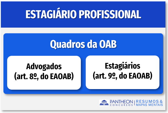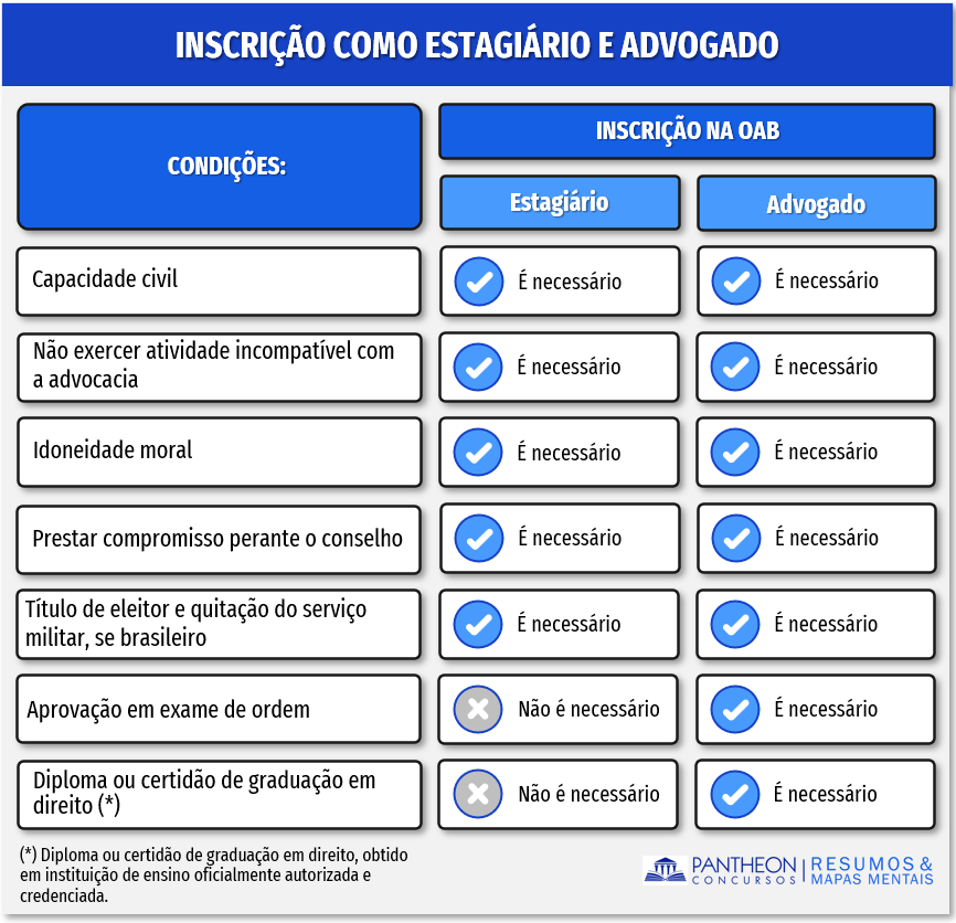 Importante: do quadro depreendemos algo lógico, apenas não é exigido do estagiário o diploma e a aprovação no Exame de Ordem, pela inviabilidade de o estagiário obter tais requisitos.