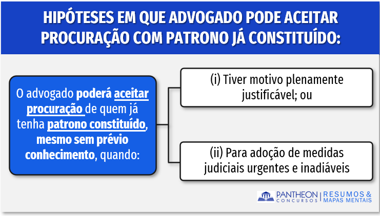O advogado não deve aceitar procuração de quem já tenha patrono constituído, sem prévio conhecimento deste, salvo por motivo plenamente justificável ou para adoção de medidas judiciais urgentes e inadiáveis (art. 14, CED). Atenção especial para a exceção: