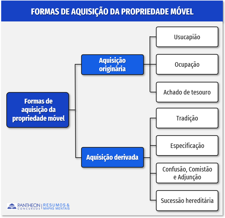 Da mesma forma como como ocorre nos bens imóveis, na aquisição originária de bem móvel não há a transmissão de uma pessoa para a outra: usucapião; ocupação; achado de tesouro. Por outro lado, na aquisição derivada há a transmissibilidade da propriedade, podendo ser: especificação; Da confusão, da comistão e da adjunção; tradição; sucessão hereditária de bens móveis.