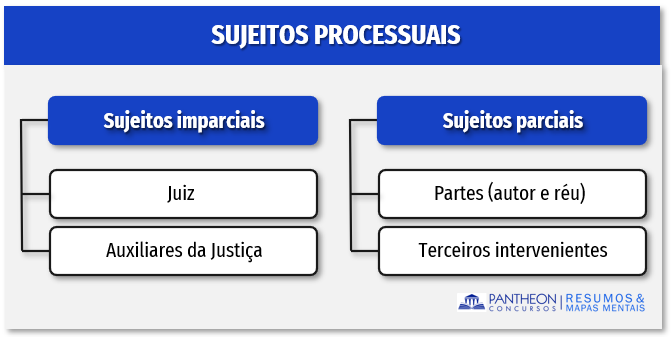 Os “sujeitos do processo” são todos aqueles que participam do processo, assim, todos aqueles atores citados acima são sujeitos do processo, pois de algum modo se relacionam ao processo. A doutrina divide os sujeitos em parciais e imparciais.