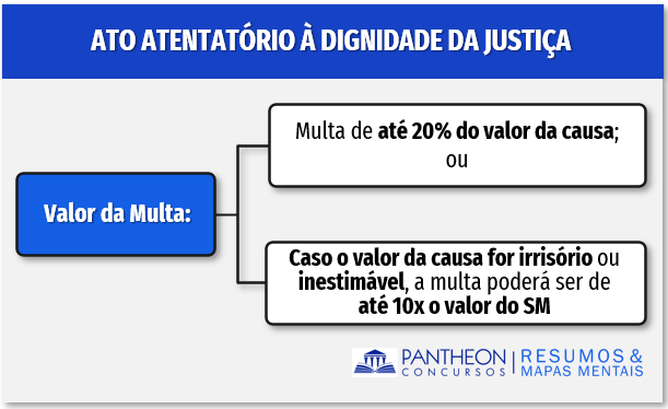 Primeiramente, em caso de punição por ato atentatório à dignidade da justiça, o juiz, sem prejuízo das sanções criminais, civis e processuais cabíveis, deverá aplicar ao responsável multa de até 20% do valor da causa, de acordo com a gravidade da conduta (art. 77, § 2º, do CPC). Quando o valor da causa for irrisório ou inestimável, a multa poderá ser de até 10 vezes o valor do salário-mínimo (art. 77, § 5º, CPC).