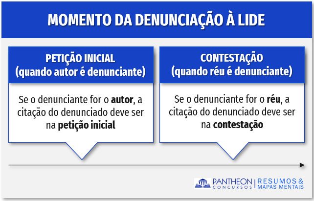 Em relação ao momento da denunciação à lide, caberá ao de denunciante quando for autor requerer a citação do denunciado na petição inicial, já no caso do denunciante for réu, deverá requerer a citação na contestação, que deverá ser promovida no prazo de 30 dias, sob pena de ficar sem efeito o chamamento (art. 126 c/c art. 131, do CPC).