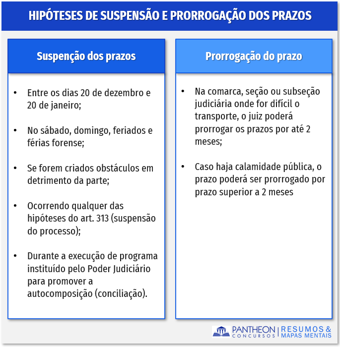Vejamos uma tabela que compila as hipóteses de suspensão e prorrogação dos prazos.
