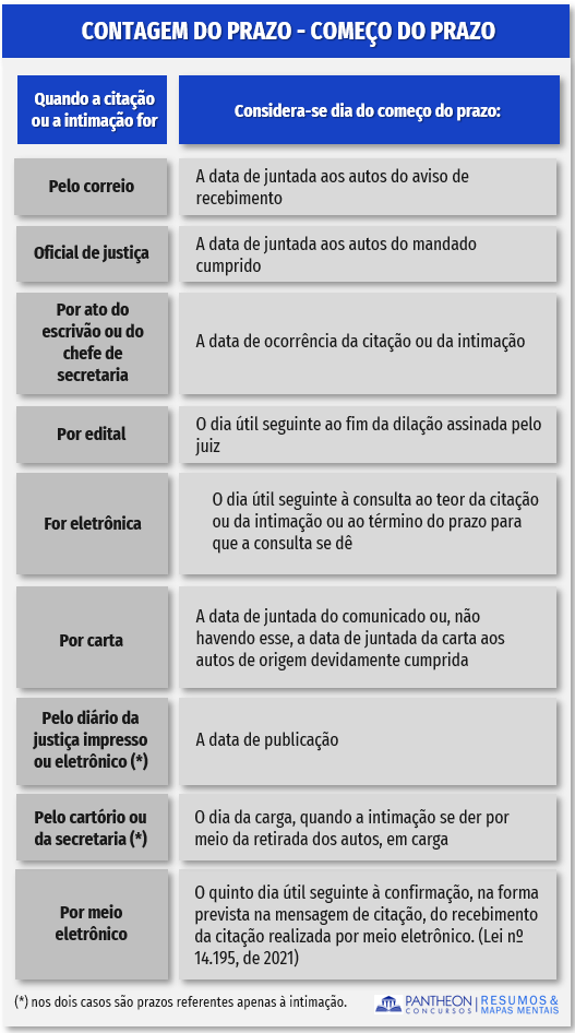 Por fim, o prazo para a parte, o procurador, a Advocacia Pública, a Defensoria Pública e o Ministério Público será contado da citação, da intimação ou da notificação (art. 230, do CPC).