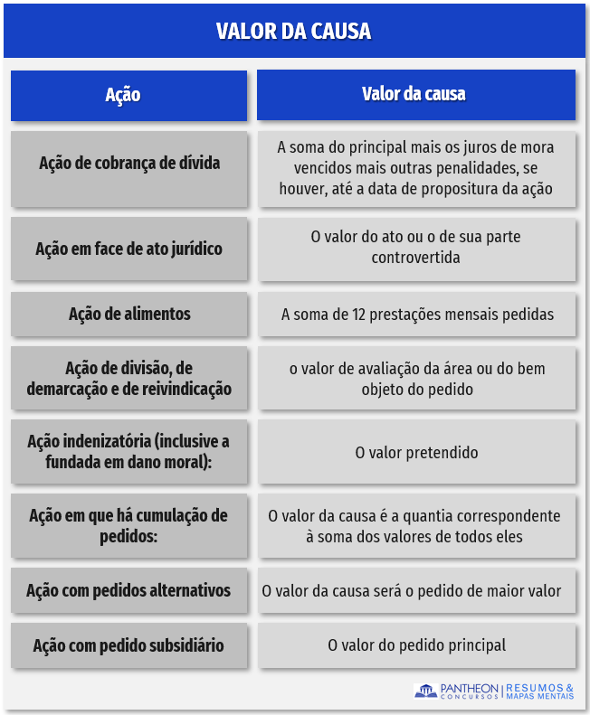 Os incisos do art. 292 do CPC estabelecem quais serão os valores da causa para determinadas ações, vamos transcrever o artigo na integra e depois vamos montar uma tabela compilando as informações para facilitar na revisão: