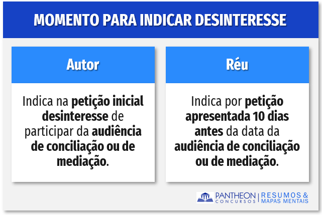Inicialmente, tanto o autor quanto o réu poderão indicar seu desinteresse em comparecer na audiência de conciliação ou de mediação. No caso do autor, deverá fazê-lo já na petição inicial, o réu deverá fazê-lo, por petição, que será apresentada com 10 dias de antecedência, contados da data da audiência (art. 334, § 5º, do CPC).