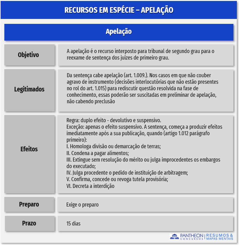 Dessa forma, a apelação, como qualquer outro recurso, tem efeito devolutivo, pois devolverá ao tribunal de segunda instância a matéria da sentença prolatada por juízo de primeira instância. Ainda, a apelação, em regra, possui efeito suspensivo, assim, a sentença recorrida ficará com seus efeitos suspensos até que seja decidida a apelação (art. 1.012). Entretanto, o § 1º do art. 1.012 estabelece hipóteses em que o tribunal não receberá a apelação no efeito suspensivo: