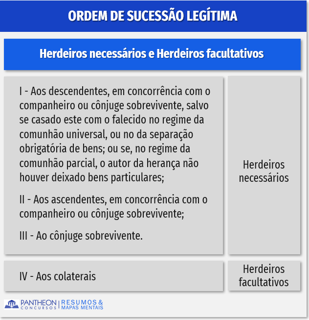 A questão versa sobre o tema Direito das Sucessões. O art. 1.845, do CC, estabelece que os descendentes, os ascendentes e o cônjuge são herdeiros necessários. Esses herdeiros receberão ao menos metade dos bens da herança – a legítima (CC, art. 1.789 c/c 1.846).